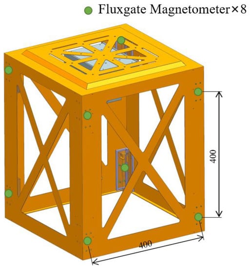 To obtain more data on spatial magnetic anomalies and ensure that the distance between each fluxgate sensitive unit is 400 mm, we adopted an array structure arrangement of 8 three-axis fluxgate magnetometers (model HSF923-2H5-AA Xi’an Huashun). The performance parameters of the fluxgate magnetometer are shown in Table 1. The fluxgate magnetometer has three sensitive units corresponding to three vertical magnetic fields, and the measurement range of each sensitive unit is −100,000 nT to 100,000 nT. We carried out experiments in Nanjing, where the local geomagnetic field is 50,000 nT ± 1000 nT. After placing the metal target, the maximum magnetic anomaly in the area does not exceed 60,000 nT. This type of fluxgate magnetic magnetometer can correctly estimate the magnetic field of the experimental area during the experiment. We call this structure the fluxgate magnetometer cube arrangement structure (FMCAS), as shown in Figure 1. Each fluxgate magnetometer obtains xyz three-axis magnetic flux data, so FMCAS obtains 8 xyz three-axis magnetic flux data, for a total of 24 groups of data.