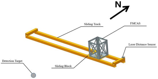 We gather an east–west magnetic field data measurement line north of the detection target. As illustrated in Figure 2, we attach the FMCAS to the sliding block with copper bolts and position it on an aluminum-alloy sliding track. The laser distance sensor (type L-GAGE) captures information on the distance between the FMCAS and the sensor. The material of the sliding block is wood; we put oil on the sliding track to promote sliding. We obtain experimental data on a measuring line every time the assistant pulls the sliding track with the rope.