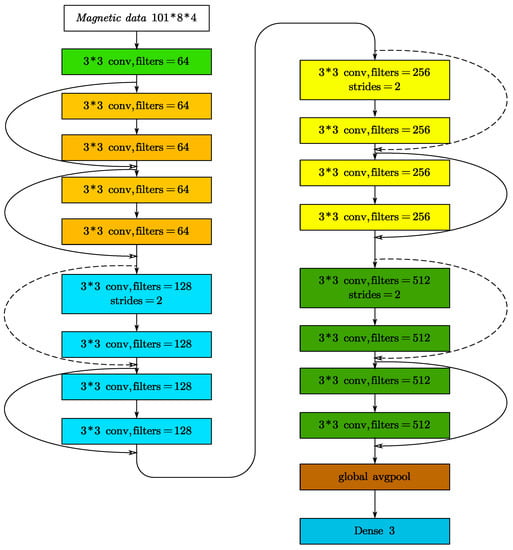 Through the above processing, we obtain an improved ResNet-18 network. The magnetic feature data are in the data format of 101 × 8 × 4, and the convolution operation is performed through a 3 × 3 convolution kernel. Then, they are input into 8 ResNet blocks, and the corresponding convolution operation is performed. The data are then globally pooled before being fed into the fully connected layer. Figure 4 depicts the network structure.