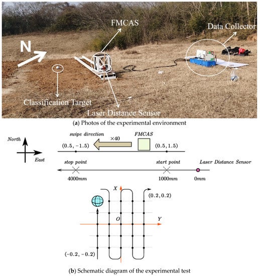 In the experiment, we use three sizes of iron balls as neural network training and recognition targets. The 5 m-long sliding track is located on the north side of the detection target, and the laser distance sensor used to record the FMCAS position information is located on the east side of the sliding track. The data collector (model: PXIe-4309-NI) is located 4 m northeast of the slide rail, as shown in Figure 5a.