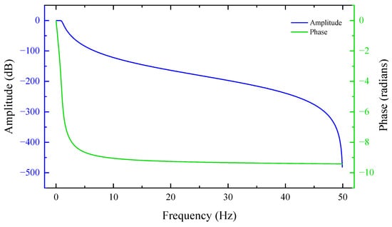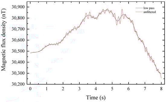 We use three different sizes of shot balls as detection targets. The lead ball is cast from cast iron. The susceptibility of the material is greater than 200. Throughout the experiment, the sampling frequency is set to 100 Hz. The power frequency signal perturbs the region where the experiment is conducted, and the DC component is the magnetic anomaly generated by the target. Therefore, the collected time-domain signal is low-pass filtered using the Butterworth filter in signal processing. The bandpass frequency is set to 2 Hz, the bandstop frequency is set to 12 Hz, and the filter is set to the 6th order. Figure 6 illustrates the low-pass filter’s performance. Figure 7 depicts the comparison before and after low-pass filtering. The red curve represents the unfiltered time-domain signal, whereas the black line represents the time-domain signal that was low-pass filtered.