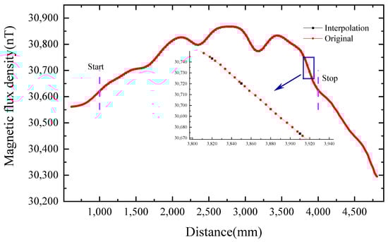 We place the starting point of the magnetic tensor matrix at 1000 mm from the FMCAS to the laser distance sensor and the endpoint at 4000 mm. We divide 101 points evenly within a distance of 3000 mm and obtain the three-axis magnetic flux density output of each fluxgate magnetic sensor at these distance points. We use the position of the FMCAS as the independent variable and use the three-axis magnetic flux density of each fluxgate magnetic sensor as the dependent variable for the interpolation calculation. For interpolation calculations, we use the position of the FMCAS as the independent variable and the three-axis magnetic flux density of each fluxgate magnetic sensor as the dependent variable. Using the linear interpolation method of sample points, according to the position we need, the three-axis magnetic flux density distribution of each fluxgate magnetic sensor at this position is determined. In this way, we can obtain the 3-axis magnetic field data of the 8-fluxgate sensor at 101 equally spaced positions between 1000 mm and 4000 mm. The interpolation method is depicted in Figure 8.