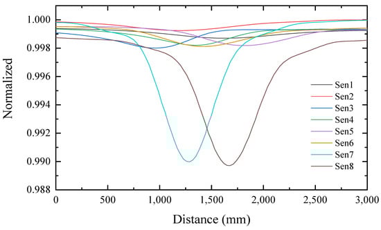 According to the above processing method, we process each set of data into a set of magnetic flux tensor matrices. The resulting matrix is mapped to the labels one-to-one. The total field distribution for the entire survey line is shown in Figure 9. From Figure 9, it can be found that the amplitude of the signal received by the No. 7 and No. 8 sensors is the largest because these two sensors are closest to the target. The distance between the two valleys is approximately 400 mm, which is the distance between the two sensors.