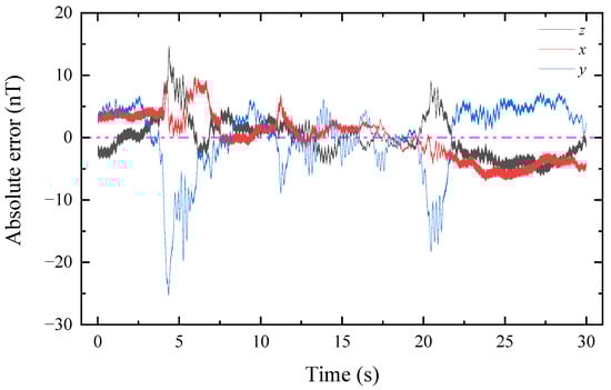From Table 4, we see that the ambient magnetic field fluctuates a lot, and the uncertainty of the collected data is caused by the fluctuation of the ambient magnetic field. We subtracted the mean value from the measured triaxial magnetic field to obtain the absolute error image of the triaxial magnetic field, as shown in Figure 10.