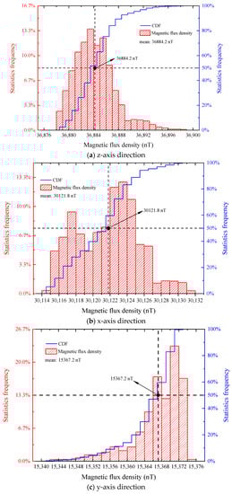By observing Figure 10, we could find that the fluctuation of the magnetic field has a random nature, and the fluctuation of the magnetic field in the x-direction is greater than that in the z- and x-directions. In order to observe the random fluctuation of the ambient magnetic field more intuitively and accurately, we made a statistical distribution chart of the three-axis ambient magnetic field, as shown in Figure 11.