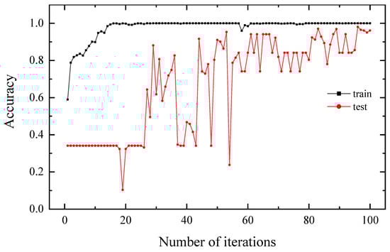 The curve of iterative convergence. The accuracy on the training set is shown by the black line, while the accuracy on the test set is represented by the red line.