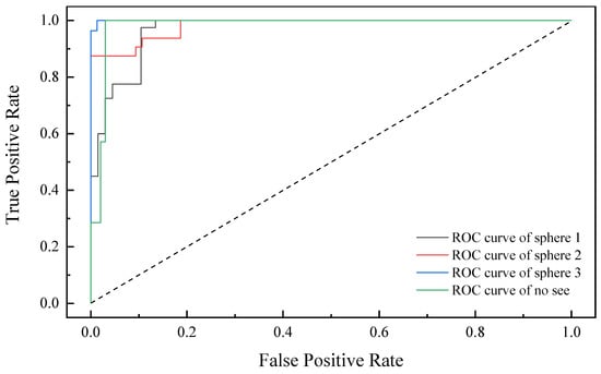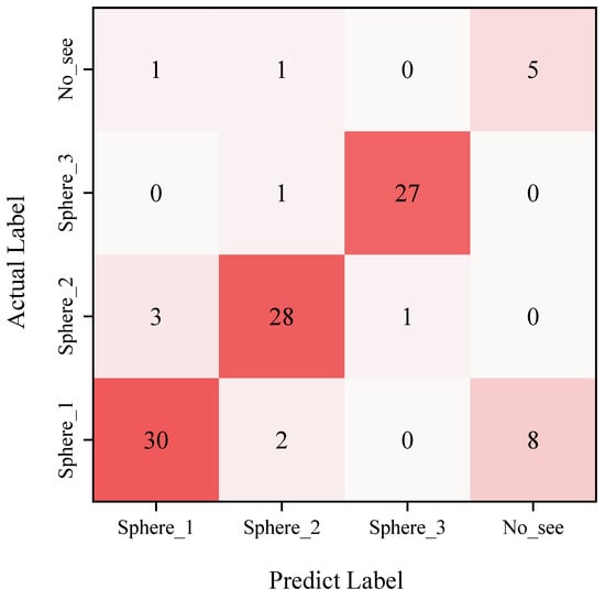 Through the analysis of the recall rate, accuracy rate, and F1 value calculated by the model, it can be seen that in the process of target classification and recognition, the single recognition accuracy of the No. 3 iron ball is the highest, and the F1 index is closest to 1. The identification between the No. 1 iron ball and no see is relatively difficult because the local geomagnetic environment has magnetic anomalies, and the diameter of the No. 3 iron ball is relatively small, which is not conducive to distinguishing the difference between the target and the environment. In other words, the magnetic anomaly caused by the No. 1 iron ball is sometimes overwhelmed by the local environment, so the recognition algorithm cannot accurately distinguish between the two. Similarly, the recognition algorithm also confuses some No. 2 iron balls with No. 1 iron balls because the magnetic anomalies between the two are not very different. In contrast, the algorithm is more accurate in distinguishing No. 1 iron balls and No. 3 iron balls.