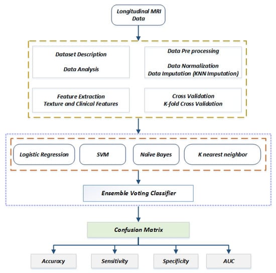 In order to combine classifiers with an enhanced prediction of data, ensemble learning makes use of a collection of decision-making systems that employ a variety of methodologies. A common method used by ensembles is a hard voting ensemble, which predicts the class that will receive the most votes based on the cumulative forecasts of all classifiers. In healthcare-related fields, ensemble learning has been used to increase the accuracy of AD prediction by utilizing the clinical experience of typical doctors [29,30]. It might be applied in primary care settings where access to specialists is constrained.