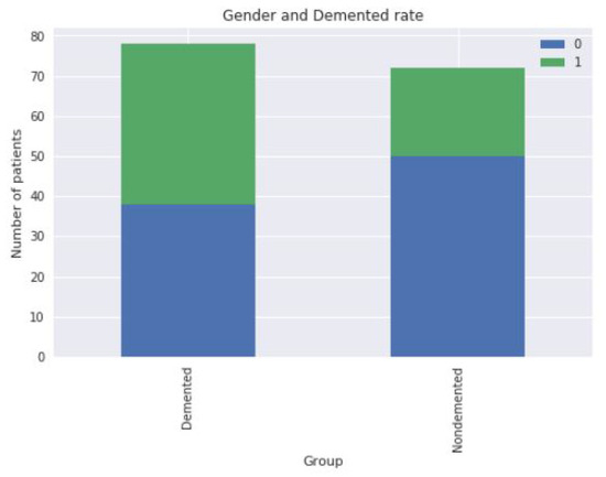 At first, we have replaced data converted to a person with dementia, as the study proposed a classifier to predict the patients with and without dementia. After that, we removed useless columns that were not needed for our research. We have a total of 15 columns or features in the dataset, and from there, we removed the 3 unnecessary columns for our final dataset. We will use a label encoder for our binary attributes, sex, and our classes, just that it will do the one-hot encoding for the supplied column. According to the data [31] we have used in this experiment, we can visualize that from Figure 2, men are more to have dementia than women. Which indicates that patients with dementia, patients without dementia, and 1 = M (male), 0 = F (female).