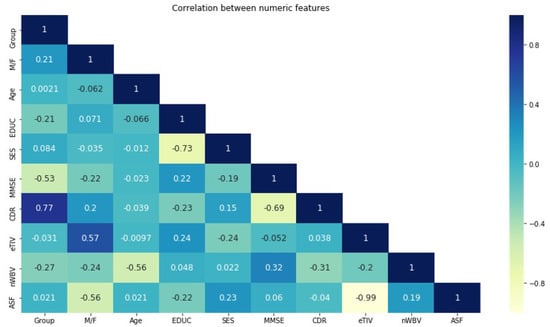 Another crucial method for dimensionality reduction is feature selection which chooses the most discriminative characteristics while also removing the redundant ones [24,37]. Feature selection is one of the first and most crucial tasks in any machine learning activity. We used the Pearson correlation coefficient [38] to choose the experiment’s input variables. The correlation coefficients for several variables are shown in a correlation matrix table. The variables are displayed in rows and columns of a correlation matrix. In order to determine whether certain variables are helpful or associated with others, the first step in any factor analysis is to create a correlation plot of all the variables. The correlation between numerical features is displayed in Figure 4. However, should be carefully taken into account throughout the feature selection process because the disease frequently affects spatially contiguous regions rather than isolated voxels. The most crucial factor that will enhance classification performance is feature selection. More crucially, due to the possibility of data overfitting, as the feature subset chosen by correlation algorithms depends on the training data set, it might not be the best choice for the test data set. As a result, ensemble learning was utilized as a generic meta learning technique to combine the predictions of various classifiers in order to increase the generalizability and robustness of individual classifiers rather than creating a single classifier with an ideal subset of features. By balancing the best feature selection with the risk of data overfitting to a particular population, this ensemble technique can reduce the potential problem of data overfitting and achieve strong generalization ability.