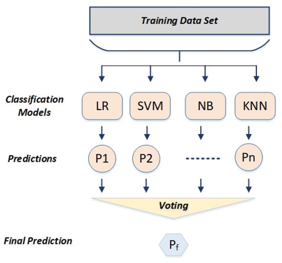 An ensemble machine learning model that integrates the predictions from various other models is known as a voting ensemble technique, as shown in Figure 5. In our study, we used the hard voting technique, which predicts the class with the highest votes based on the combined predictions of each classifier.
