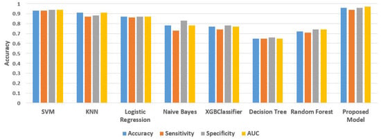 On the OASIS dataset, Table 3 displays the binary-class classification performance of our suggested voting ensemble model. We used the four classifiers SVM, KNN, naive Bayes, and logistic regression and ensemble them using the voting ensemble method because they outperformed all other models in terms of performance. Machine learning models can function quite well on their own, but in this study, we found that merging a number of the best-performing ML models can lead to even better outcomes. When evaluated using several evaluation metrics, the suggested model outperforms the individual models. The suggested voting ensemble model accuracy is 0.96; its sensitivity, specificity, and AUC are 0.94, 0.96, and 0.97, respectively. Figure 6 compares the performance of the classification outcomes of the proposed voting ensemble model and the four traditional classification models. It can be noticeable that SVM and KNN have shown exceptional performance for classification. The dataset should be initialized, and then k-nearest neighbors should be used. The distance between the neighbors needs to be calculated next. The classification of output labels must be completed last. The value of k is fixed by iteration and is dependent on the classification accuracy. For the classification in this analysis, the number of neighbors is set at 5, and it was chosen using the trial-and-error method. We discovered that setting the classifier’s value to 5 gave us the best results.