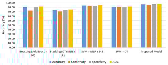 Table 4 displays the outcomes for binary class categorization using different ensemble models. It specifies that results obtained using different ensemble classification methods on the same data. Table 4 makes it clear that our suggested ensemble model outperforms other ensemble models in terms of accuracy. In Figure 7, five ensemble strategies for categorizing people as insane or not were compared. When compared to previous ensemble approaches, which need a lot of resources and take a long time, our suggested method computes binary classification accuracy with a significant margin of error.