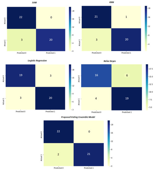 In Figure 8, we show the confusion matrix of SVM, KNN, logistic regression, and proposed voting ensemble model performance for the MRI data. The x-axis represents the predicted categories, and the y-axis represents the actual categories. As shown from the figure, we have used 30% of the total data for testing purposes, so 45 patients are used for testing. The figure depicts that the SVM classifier’s total of three patients had inaccurately predicted, whereas the KNN classifier’s total of four patients had inaccurately predicted; the logistic regression classifier’s total of six patients had inaccurately predicted. Although there is still space for improvement, it is clear from the figure that the suggested voting ensemble model is very accurate in classifying these groups and total oftwo2 patients had inaccurately predicted.