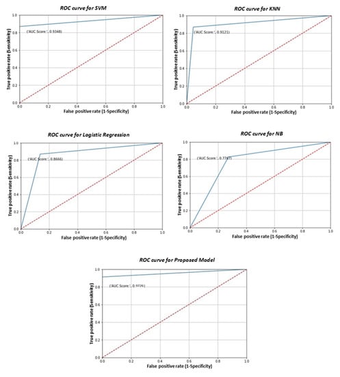 The AUC is an overall indicator of a classifier’s performance across all decision criteria. Receiver operating characteristics (ROC) curves are used to determine which of the used models predicts the class best and most beneficial of its application. We use a ROC plot to see how well a model performs between sensitivity and specificity. The capacity to appropriately identify classes as belonging to the positive class is referred to as sensitivity. Specificity is the ability to identify entries that belong in the negative category accurately. The true positive rates are deployed in a blue line, and false positive rates are plotted in a red line. The better a model is, the closer its AUC is to 1. As a result, models with higher AUC values are favored over those with lower AUC values. Figure 9 is showing different models ROC curve results.