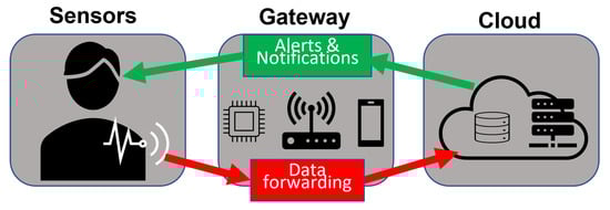 In contrast, the large distances between the data sources and Cloud data centres mainly contribute to latency concerns. Slow response times in Cloud-based architectures also arise because warning or intervention solutions originate from the same Cloud data centres located far away from the user [,,]. This property, as a result, confines the application of these frameworks to application use cases where real-time or timely interventions are not functional requirements, thus limiting the range of possible healthcare services offered by the Cloud-based IoT frameworks [,,,,]. In response to these concerns and limitations, the Edge and Fog Computing paradigms facilitated the realisation of IoT-enabled healthcare application frameworks offering better response time and privacy preservation [,].