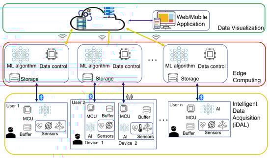 Based on the analysis reported in the literature review and the consequent observations and requirements defined previously, this section presents the architecture for a real-time IoT-aware healthcare system that incorporates advanced multi-sensing technologies, Edge-based and on-device AI components. The proposed architecture contains three main layers, namely, (i) Intelligent Data Acquisition Layer (iDAL), (ii) Edge Computing Layer, and (iii) Data Visualisation Layer, as illustrated in Figure 2. One of the critical features of the proposed architecture is the modularity and distribution of duties among components to facilitate easy upgrade and fulfil functional requirements, FR1 and FR2.