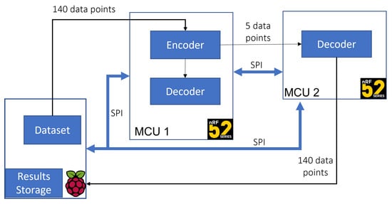 Various software tools, libraries, and frameworks have also been developed to facilitate the deployment of AI algorithms on constrained devices. For instance, TensorFlow lite for MCUs (TFLM) [], an open-source library, can be used to support the deployment of Neural Networks (NNs) on a wide range of MCUs and Digital Signal Processors (DSPs). It has been tested on several Cortex-M series MCUs and can be used to deploy static algorithms trained using TensorFlow [] to perform on-device inference. STMicroelectronics [] also developed X-Cube-AI; a software tool that allows the generation and optimisation of AI algorithms developed using the typical ML and AI frameworks such as TensorFlow [], Keras [], or PyTorch [] for deployment on the STM32 family MCUs. In addition, Edge Impulse [] is a Cloud-based tool that allows the development of both NN and non-NN models for various embedded platforms such as MCUs or mobile phones. This tool allows the collection of sensor data directly from supported devices to train ML models, thus enabling fast prototyping of on-device ML architectures. Another available tool is NanoEdge AI Studio [], which supports both learning and inference inside the MCU. This tool allows the automatic selection of ML libraries best fitting the provided data, making this tool suitable for developers with little or no AI or ML experience also. This tool contains libraries for the development of anomaly detection algorithms, one-class classification, multiple-class classification, or regression algorithms. The available tools can be selected based on available hardware and the developer’s expertise. Other available tools that can be leveraged for the deployment of the selected ML algorithm can be found in [,].