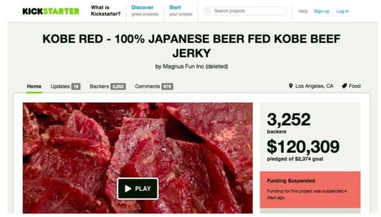 One well-known case of attempted crowdfunding fraud [] is “Kobe red beef jerky” on Kickstarter shown in Figure 1, a project by Magnus Fun Inc., who claimed to provide fresh Kobe beef-based jerky from Japan and posted fake user experiences showing they loved the taste. It almost enabled a $120,309 heist, nearly 50 times the original financing goal of the campaign, from 3252 backers (i.e., investors) in just less than 1 month. Fortunately, Kickstarter pulled the plug on this fraud at the last minute of the fundraising period, as a documentary film project “Kickstarted” had publicly raised concerns and suspicions on the project’s authenticity, in an in-depth Reddit post [,].