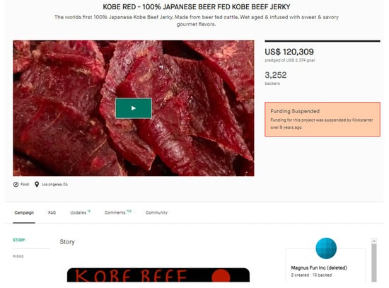 - Kobe Beef Jerky Kickstarter Fraud Nearly Scammed Backers out of $120,000. Available online: https://money.cnn.com/2013/06/17/technology/kickstarter-scam-kobe-jerky/ (accessed on 21 June 2022).