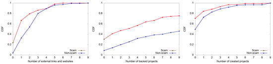 Creator-related features such as whether there is a link to a Facebook ID, the number of external links and websites, the number of the creator’s backed projects, and the number of created projects are found to be significant features in our model. We found that having a Facebook ID with ( = −1.326, p < 0.01) and external links with ( = −0.665, p < 0.001) reduces the probability of being a scam by 74% and 49%, respectively. We observed that only 35% of scam projects have a link to a Facebook ID, whereas 55% for non-scams have such links. Similarly, on average 1.57 and 2.51 external links were found in scam and non-scam campaigns, respectively. Figure 3 shows the cumulative distribution function (CDF) of the selected key creator-related features. As shown in Figure 3a, 66.7% of scams (i.e., twice as many as non-scams) have 0 (23.5%) or 1 (43.1%) an external link (to websites), whereas only 4% and 28.6% of non-scam projects have 0 or 1 external link. These results indicate that scammers are, in comparison with non-scammers, more reluctant to reveal or provide their own personal or additional information.