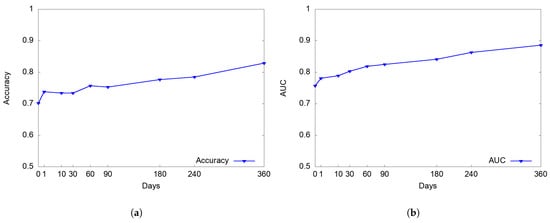 Figure 4 plots the average classification performance over elapsed time after project launch. On the very first day (i.e., 0-day) of project creation, (as shown in Table 2) with only six features available by then in the Campaign section and creators’ profile and behavior information such as a link to a Facebook ID, the number of external links & websites, backed or created projects, redundancy and the number of images in a Campaign, our model achieves 70.2% accuracy (with 0.757 AUC) in detecting scams. We found that the number of created projects beforehand was a good precursor particularly for early identification of non-scam projects; our model achieves 59.5% accuracy (with 0.606 AUC) when used only with the feature. Our results indicate that the Campaign section and creator-related information contain useful information for early scam detection, yet the accuracy increases further as time goes by, with more information becoming available from Updates and Comments; the accuracy increases from 70.2% to 73.8% in just one day after project launch. Within one or two months, which is often the recommended or maximum length of crowdfunding campaigns on Kickstarter, respectively, our model’s performance increases to 73.4–75.7% accuracy, and then up to 82.9% in one year.
