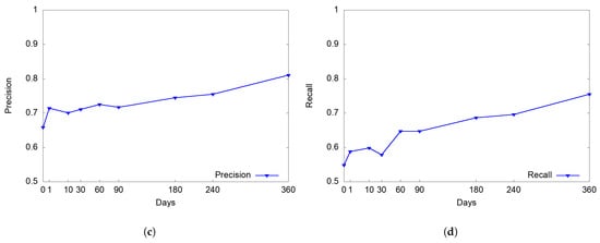 As shown in Figure 4c,d, during the initial two months of the project (i.e., the maximum funding period), recall increases from 54.9 to 64.7%, whereas precision reaches 65.9 to 72.5%, which is relatively (7.8–11%) higher than recall. Then, precision increases to 71.7%, 74.4%, and 81.1%, while recall increases to 64.7%, 68.6%, and 75.5%, respectively, in 3, 6, and 12 months. This indicates that as time goes by, as more data from the Updates and Comments sections arrive, our scam detection model becomes more precise as well as complete.