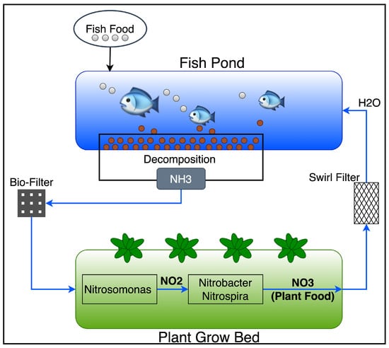 The aquaponics system comprises the dynamic interaction of fish, plants, bacteria, and their aqueous environment []. The main intention of an aquaponic system is to reuse nutrients being pulled out of fishes which are necessary for growing plants []. Fish are grown in a fishpond, and they are regularly fed. Along their vital cycle, they produce decompositions that are rich in ammonium (). Such decompositions will travel along the pipeline system into the growing bed with plants and bacteria in the soil, as shown in Figure 1 below, which depicts the basic principles of an aquaponic system. The bacteria in the soil transforms ammonium ions () firstly into nitrites () then nitrates (). Nitrates () are absorbed by the plants as part of their vital cycle, then water is oxygenated () and filtered off. To close the loop, the oxygenated water can be returned to the fishponds, and depending on the size of the fishpond and the growing beds, one or two additional filters may need to be inserted along the cycle. First, a biofilter could be in the segment between fish decomposition and plants. This filter is not habitable by bacteria that facilitate the transformation from ammonium () to nitrates (); hence, it could be inserted to help control the population of bacteria in the system. Second, a Swirl filter could be placed in the segment between the plant evacuation and fishes’ intake of water. The purpose of this filter is to purify the water by eliminating solid materials, thereby making it suitable for fish life. This solid material is usually present when the plants cannot provide sufficient filtering (i.e., due to different parameters, e.g., size of the bed, number of fish, etc.).