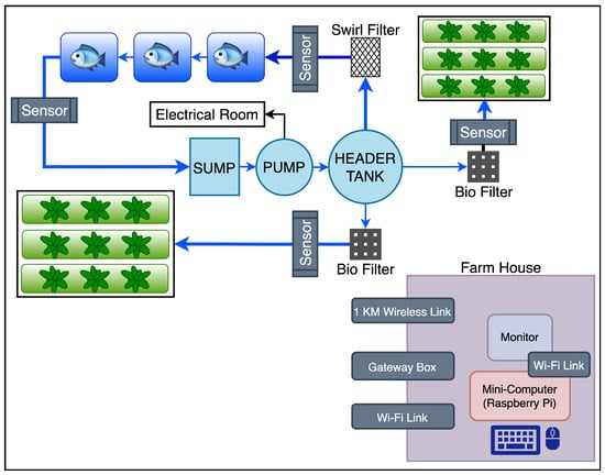 Aquaponics and aquaculture has received growing concern in modern times, and this reinforces its increasing impact on society as an innovative response to food security []. Technological advancements in agriculture have opened a path for modern agricultural practices such as aquaponics, which is an eco-friendly system for cultivating fish and plants without soil []. Aquaponics is a symbiotic system which combines aquaculture with hydroponics in fish and plant cultivation to save water and utilize dissolved nutrients more efficiently, without the use of agrochemicals []. This advancement has also opened a new era for the design and development of both fish and plant health monitoring systems [].