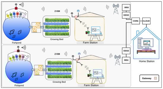 Figure 3 shows the proposed IoT system architecture for aquaponics monitoring. This system is comprised of a farmhouse which houses a monitor, WiFi link (or wireless technology), keyboard, mouse, and gateway box. The system also considers a growing bed; a 1 km2 wireless link; a sensor box with a set of sensors deployed in the field according to the analysis in Section 3.1, where different types of field sensors will be deployed in fishponds; a sump; and filters to monitor appropriate metrics. The farmhouse (as explained in Section 6) contains a gateway sensor, which forwards all the metrics from LoRa technology to other technologies and a monitoring station, which allows the first visualisation and control of the metrics. The gateway sensor also allows the connection to other infrastructures through WiFi or LTE-M/NB-IoT. This infrastructure allows the connection to the CORE and Cloud and the monitoring from a remote/house station.