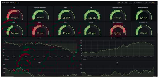 In terms of the software to show the real-time data monitoring information of the whole system, several monitoring tools are available on the market. We have been customizing Grafana as the tool to display the sensor metrics on screen. Figure 13 shows the graphical interface shown to farmers on the mini-computer. Using displayed or obtained information, the farmer decides whether to open the air pump, water pump, lights, and feeder or make other changes required to sustain fish and plant health.