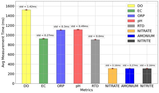 As a proof of functioning and performance, the first test of the WaterMon node is the time measurement for every sensor sending information to the farmhouse. Figure 14 shows that the most time-consuming measurement is DO, which takes an average time of 1.5 s for every measurement and sending cycle; the pH and ORP sensors take an average time of 1.1 s approximately; and the EC and RTD sensors take 0.9 s approximately. This fact is mostly due to the need of some compensations for the measurements. The analog sensors are more fluent in their measurements, with 0.3 s each.