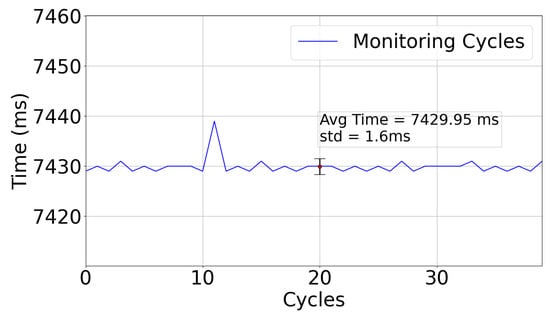 In order to evaluate the whole monitoring cycle in the WaterMon node, a test with the node just collecting cycles of parameters has been conducted. Figure 15 shows a plot of the time used for each cycle, which takes, on average, 7430 ms (with a standard deviation of 1.6 ms).