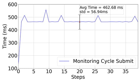 Figure 16 shows the timing used to submit the information to the farmhouse from the values collected at the node. For a number of monitoring cycle submissions, the average value is 462.7 ms (with a standard deviation of 56.9 ms).