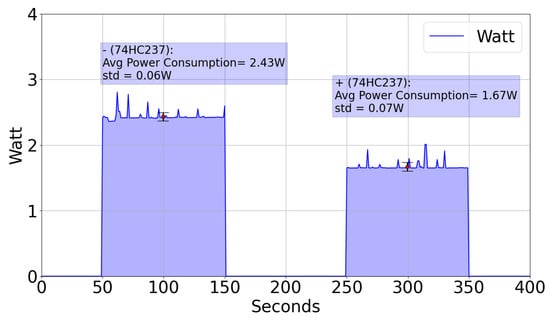 Finally, an energetic consumption test has been conducted to assess the effectiveness of the energy-aware implementation for this system. Figure 17 shows the power consumption measurement during 100 s of the WaterMon sensor. As it can be seen, the average power reduction for the situation with and without the IC 74HC237 is 0.76 W in 100 s, when we use the IC. This reduction allows us to extend the lifetime of the power supply for this purpose. For instance, if the power supply is batteries, a commercial power-bank with 20,000 mAh will give the WaterMon sensor without the IC a lifetime of 41.2 h, while if we consider the use of the IC, the lifetime is extended up to 59.8 h, an increase of the power-supply time of 68.9%.