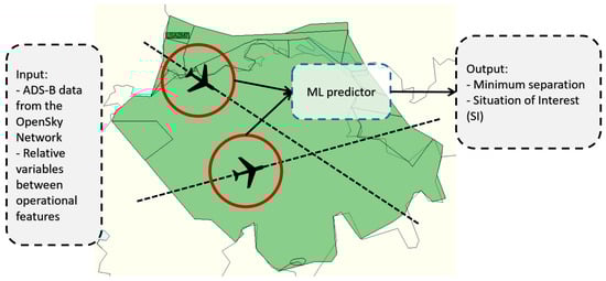 This tool aims to perform CD predictions among pairs of aircrafts in the airspace. Conflict is defined by ICAO as any situation where the separation minima could be a compromise in the near future [23]. One distinguishing feature of the CD tool is that it does not perform trajectory predictions and then analyses separation infringements, but it performs predictions for separation infringements based on historical data. This section is a summary of the work previously developed by the authors in [22,24]. Figure 1 shows a summary of the operational capability of the CD tool.