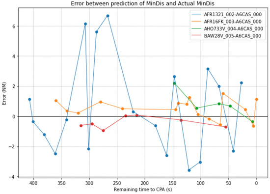 The assumption considered is that the predictions of the ML algorithm should improve (by reducing the error between real and prediction) throughout the evolution of aircraft pairs. In the same way aircraft pairs are getting closer to the Closest Point of Approach (CPA), their prediction should improve due to diminishing uncertainties (aircraft location, weather or wind). The first analysis consists of evaluating how the error differs between the prediction and the real value of MinDis as function of the time to the CPA. Figure 3 shows the evolution of the error for four aircraft pairs.