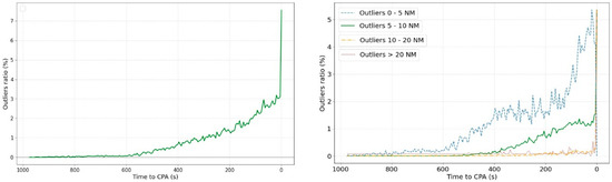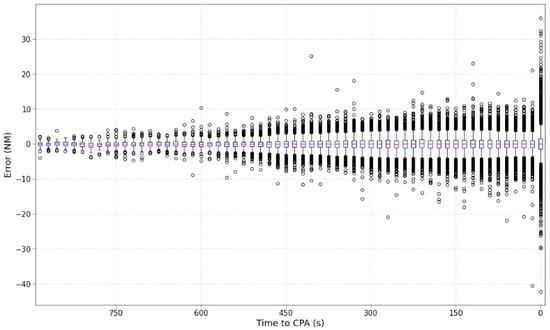 Figure 5 shows the statistical information (based on boxplots) split every 15 s to facilitate the representation of the results. The mean value is located throughout time very close to the 0-value error, this means that the algorithm works correctly on average. However, it can be clearly identified how the size of the boxplots enlarges accordingly with the number of outliers as the CPA approaches. Figure 6 shows information related to outliers in the predictions. Outliers are data points that are statistically noticeably different from the rest. Herein, it has been detected based on boxplot techniques.