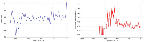 Observing Figure 7 left, it can be observed that most of the mean values throughout the evolution are below 0 (negative values). This means that the ML predictor tends to provide a lower value than the real one, that is, the algorithm tends to be conservative. Although this result could be beneficial for safety, it could be on its way around because the number of false alerts could increase. The ATCO would be notified, on average, more times than it should be. Figure 7 right shows the percentage of predictions that provided a negative value, i.e., the MinDis prediction acquires a value < 0. This is an error of the ML algorithm because it has not been trained on negative values (no negative values were in the training data). Regrettably, there are no mechanisms to directly avoid this type of results during the training phase of the algorithm.