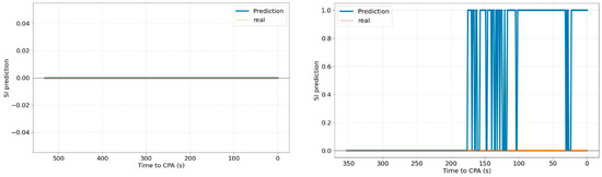 The left figure shows a stable prediction (No SI) that does not change throughout the time. The figure on the right shows an unstable prediction that jumps from 0 to 1 (SI or no SI). These changes in the prediction occur when the probability of it is very low (around 50%). The stability of the classification predictions has been studied throughout the time. The percentage of aircraft pairs for which the classification predictions are unstable (does not provide the same prediction throughout its evolution) is 20.6%. This value should be evaluated in an in-depth study in further work trying to reduce it or, at least, the number of leaps throughout the time.