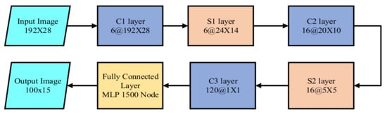 CNN was first introduced to extract the lane feature in LMD by Kim et al. [17]. Additionally, random sample consensus (RANSAC) was used to group the identical architecture of the lane locations. The CNN architecture, shown in Figure 2, consists of three convolution layers, two subsampling layers, and three fully connected layers (FCL). The input dataset was converted into 192 × 28 after the ROI and edge detection. The last FCL provided the predicted output of 100 × 15.