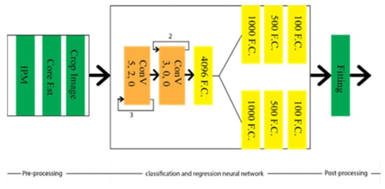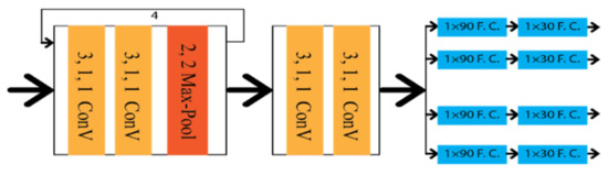 EELane and VPGNet showed the effectiveness of the multi-branch techniques where lane detection can be guided from prior knowledge by sharing different tasks into contiguous representations. Huang et al. [28] combined the spatial and temporal data in the CNN framework to detect the lane markings by selecting the lane boundaries. Therefore, the computational time is reduced, allowing it to be run more effectively in the automated driving car under intricate weather and traffic schemes in real-time. With this aim in mind, lane location estimation is obtained by evaluating Inverse Perspective Transformation (IPM) from the overhead view of the images using spatial and temporal relevancy of lanes. The images are cropped into relevant sub-image, carrying out the local lanes’ boundary information. Sequentially, the CNN framework is applied to detect the actual location and boundary of the lanes. The final structure is optimized to reduce the computational complexity by selecting the adjacent lanes based on the lane change for searching for the lanes’ actual position. The architecture of the network is depicted in Figure 4. The study of spatial and temporal relevancy of lanes made it different from EELane and VPGNet, whereas IM’s implementation created the condition of its robustness. However, this makes up for low illumination conditions, such as at night and rainy conditions [28].