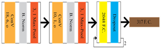 Image classification refers to the discrimination process of objects available in the input image frame. However, the location of the lane can not be tracked through this process. Therefore, some modification is required in the classification technique to track the lane’s location. Let us consider the amendment on the classification is y = f(x,pm(p)), where f(x) is the CNN mapping function, and pm(p) is the prior knowledge depending on the lane location. Gurghian et al. [18] have come up with DeepLane depending on the same idea, which network architecture is shown in Figure 5. DeepLane received the training dataset, which was created from the image frames of the downward camera. It was classified into 317 classes, among which, 316 were for the probable lane position and reaming one was for missing lanes. A softmax function was applied to the last fully connected layer to achieve the probability distribution. The lane position was estimated Ei through the following equation: