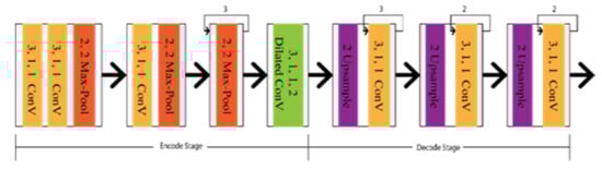 Chen et al. proposed a Deep Convolution Neural Network based on the lane markings detector (LMD), aiming to have the optimal CNN architecture design with dilated convolution [40]. The lane markings detector, similar to ResNet [41] and VGG [42], is used as an encoder to classify, and DeconvNet [43], U-Net [44], and FCN [45] are used as a decoder to create feature maps. Additionally, dilated convolutions were embedded in the encode–decode section of the architecture shown in Figure 6. Lo et al. [40] introduced a CNN architecture based on DDB (Digressive Dilation Block) and FSS (Feature Size Selection), considering the spatial and downsampling operation, which was also embedded with dilation convolution [46].