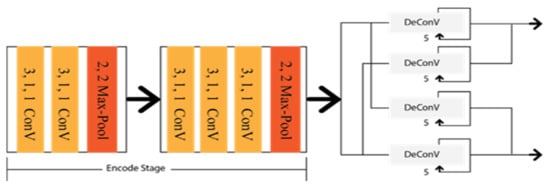 Geometrical features of roads also have an important role in lane marking detection, which have better performance results than VPGNet. Zhang et al. [59] proposed Geometric Constrained Network (GLCNet), which has multitasked to interlink the lane boundary and lane segmentation sub-structure. The architecture of GLCNet [59] is shown in Figure 8, which indicates that every decode section has a link with the encode section to transfer corresponding features into two distinct tasks. Therefore, the information from the decode sections can be redounded reciprocally. This multitask strategy opened the gate for the researchers to develop a framework for the link between lane boundary and lane area. Considering the same idea as GCLNet, John et al. [60] designed PSINet for multiple detection purposes, such as road scene labels, lane marks, and free space on the road.