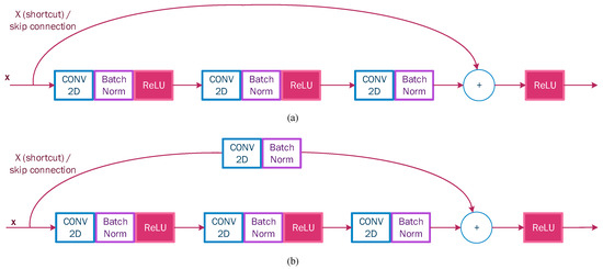 Figure 5), where the input is passed to a deeper layer. In other words, the simple deep convolutional neural network is inspired by VGG with 3 × 3 filters and a ReLU activation function, which is modified to become a residual network by adding skip connections to define residual blocks. On the top, the architecture contains a fully connected output layer with a softmax activation function for classification.