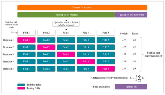 Figure 11). During iterations, each of the subsets are used as validation data or testing folds and the rest (K−1) as training data or training folds. The cross-validation process is performed repeatedly for K iterations, with each of the subsets of validation data. The arithmetic average of the results of each iteration is finally performed to obtain a single result. This method is highly efficient as we evaluate it from K combinations of training and validation data, but it still has a disadvantage, that is, computationally, it is slow. However, the choice of the number of iterations depends on how large the dataset is. Cross-validation is most commonly used with K values ranging from 5 to 10. If the model (estimator) is a classifier and the target variable (y) is binary or multiclass (as in this research), the StratifiedKfold technique is used by default. This approach introduces stratified folds, i.e., by keeping the proportion of samples from each class in all folds. Therefore, the data from the training and testing folds are distributed equally. It is useful when unbalanced datasets are used. To evaluate the results, we used several metrics that are very common in machine learning applications for classification problems.