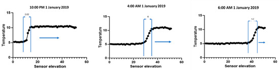 After collecting the data from the TES sensors, the data was analyzed in an Excel worksheet. Figure 3 shows that during charging, the temperature distribution moves from the bottom to the top direction, and the width of the thermocline thickness increases with the passage of time. This behavior has been verified in many previous studies, such as [6,38,39,40]. Evolution of temperature distribution and thermocline thickness during charging is shown in Figure 3.