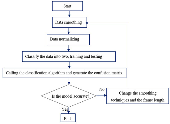 The performance of the classification model prediction is tested using a variety of techniques. It is conventional to use 70% of the data set for training and the remaining 30% for testing the model’s efficacy. This approach is known as leave-p-out. Cross-validation is the second type of model training and testing strategy, and works by dividing the given dataset into training and validation data subsets and then rotating the evaluations among the subsets; it can assess a classifier’s generalized overall accuracy on an unbiased dataset. When the data set is small, cross validation is used. A generalization called k-fold cross-validation divides the data into k−1 training sets and a validation set. The partitions must roughly be equal in size and are formed by randomly choosing data. The average of each performance metric, such as classification accuracy, will be the outcome of cross-validation. K-fold cross validation means using the partition just once while repeating the validation k times. MATLAB programming language was used to develop the classification algorithms. During development of the SVM and KNN prediction model, the frame length for both moving average filter and moving median filter was 20. The frame length was varied and finally a frame length which leads to the best classification accuracy was selected.