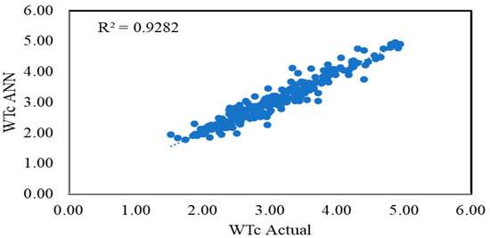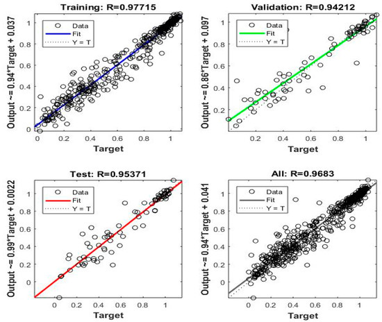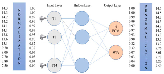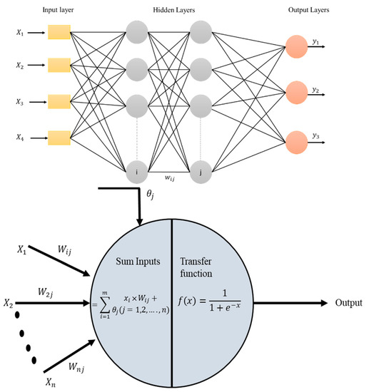 After the data collection and preprocessing, ANN modeling was performed using the feed-forward backpropagation technique [44] as shown in Figure 9. The mathematical form of artificial neural network is presented in below.